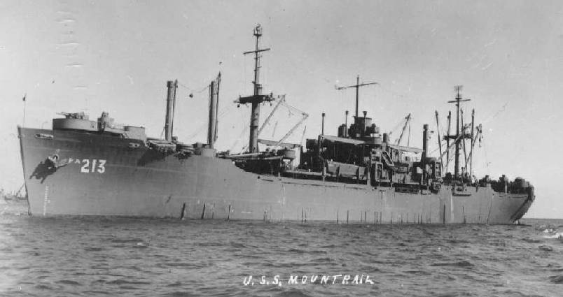 Mountrail - DANFS history Named after a county in North Dakota. Mountrail (APA 213) was built under Maritime Commission contract by Permanente Metals Corp., Richmond, Calif.; launched 20 September 1944; sponsored by Mrs. Margaret H. Marshall; and commissioned 16 November 1944, Comdr. R. R. Stevens in command. Following shakedown, Mountrail embarked troops at Seattle and sailed for the Philippines 10 January 1945. Reaching Leyte Gulf 21 February, she put to sea with men of the 77th Infantry Division for amphibious training off Leyte before departing San Pedro Bay 21 March to join a convoy for the Okinawa invasion. She arrived off Kerama Retto 26 March. While she landed troops 2 April, her gunners shot down three planes. Mountrail departed Kerama Retto and arrived San Francisco 22 May to load troops for the Philippines, whom she disembarked at Manila. Returning San Francisco 5 August, she sailed with more troops, landing them at Batangas, Luzon, 11 September. At Leyte Gulf she took on occupation troops whom she landed at Hakodate, Japan, 4 October, then carried Marines from Japan to Tsingtao, China, before sailing for home 5 November. She decommissioned 12 July 1946 and entered the Pacific Reserve Fleet at Stockton, Calif. With the outbreak of the Korean conflict, Mountrail recommissioned 9 September 1950, and sailed 22 December for the Far East to carry men between Japan and Korea until returning San Diego 2 August 1951. On 28 May 1952, she sailed for her second tour of duty with the 7th Fleet, operating between Hong Kong and Korea for the next 6 months. On 14 October she joined in the feint off Kojo, Korea, which tricked the Communists completely. She returned to Long Beach in December and trained on the west coast until sailing for Japan 28 November 1953. She sailed between the Philippines and Japan until August, when she joined operation “Passage to Freedom,” the massive evacuation of refugees from North to South Vietnam. She returned to Long Reach 9 October 1954, and decommissioned 1 October 1955 to return to reserve. Mountrail recommissioned 22 November 1961 and sailed to join Amphibious Squadron 12, Atlantic Fleet. During training, she operated in the Atlantic and Caribbean, strengthening American forces at Guantanamo Bay during the Cuban Missile Crisis of fall 1962. In October and November 1964 she took part in NATO landing exercises in southern Spain, and 8 February 1965 she left Norfolk for her first deployment with the 6th Fleet. She took part in exercises off Norway in June and July, returning Norfolk 20 July. Into 1969, Mountrail has continued annual deployments with the 6th Fleet, strengthening the amphibious capability of this bulwark of freedom in the Mediterranean. Mountrail received one battle star for World War II service and three for Korean service. Specifications: Officers 56 Enlisted 480 Officers 86 Officers Enlisted 1,475 one single 5"/38 cal dual-purpose gun mount four twin 40mm AA gun mounts one quad 40mm AA gun mount ten single 20mm AA