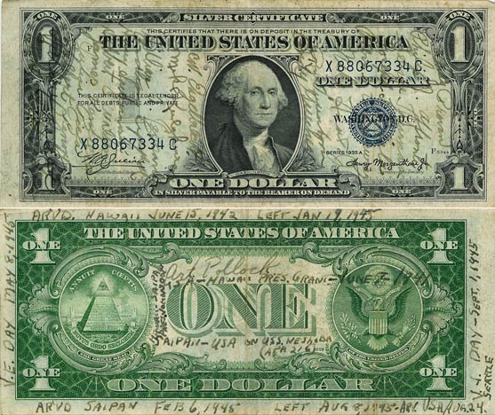 I just viewed your USS Neshoba Site, and wanted to let you know that I have a $1 bill signed by many of the crew of the Neshoba, and written on the reverse is ports of call dates from 1942-1945. It belonged to my Great Aunt's Husband. He was aboard the Neshoba, his name was Donald Arthur (Art) Pollock.