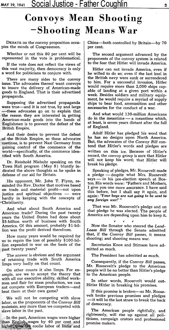 He was a "conservative" talk show host with a audience of millions. In August 2006 I picked up a copy of his magazine Social Justice (May 19, 1941). Most of the articles were similar to the one at left. I have posted it because it was the most complete in stating the view point that we should abandon England and had nothing to fear from Hitler. His point of view was shared by many in the "loyal opposition" to the Democrats of the day. Charles Lindberg is the topic of another article. Lindberg favored letting Japan have it's sphere and Germany it's sphere. Many thought he could become President one day. Willke, the Republican candidate in 1940 was endorsed by the German American Bund... Most of this history is forgotten. |