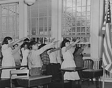 SEC. 7 The Pledge of Allegiance to the Flag, "I pledge allegiance to the Flag of the United States of America, and to the Republic for which it stands, one Nation under God, indivisible, with liberty and justice for all", should be rendered by standing at attention facing the flag with the right hand over the heart. When not in uniform men should remove their headdress with their right hand and hold it at the left shoulder, the hand being over the heart. Persons in uniform should remain silent, face the flag and render the military salute. Note: (this represents two major changes, the salute was VERY different before 1942 and the original pledge was: “I pledge allegiance to my Flag and the Republic for which it stands; one Nation indivisible, with Liberty and Justice for all.") It was written by Francis Bellamy. italics added...
